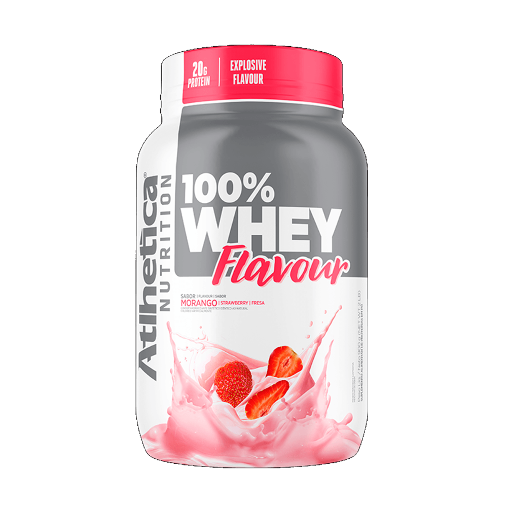 O 100% Whey Flavour Morango Atlhetica, ajuda no ganho de massa muscular, auxiliando na redução da fadiga muscular e ajudando na recuperação muscular no pós-treino.