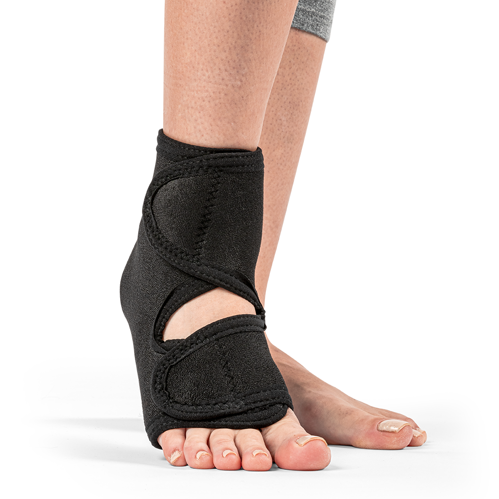 Coloque a órtese de maneira que o orifício fique posicionado no calcanhar e ajuste abas com fecho aderente, no peito do pé e no tornozelo de modo que fique confortável.